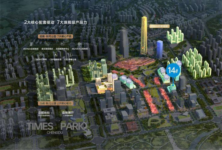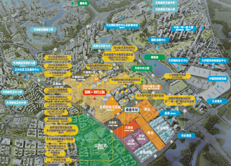招商·时代公园位于天府新区总部商务区核心引擎位置,其用地前身为四川省政府行政预留地。即原秦皇寺区域,紧靠天府中央公园,向西链接成都双流机场,向东直达天府国际机场。项目周边已签约59个重大产业项目,总投资约2312亿元,其中包括德勤、华汪中铁、中建、中粮、中国建材、川投、新希望等多个集团总部项目。
