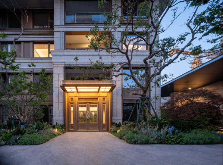 【浦发莲园】归家仪式的设计独具匠心,巧妙融入法国进口的圣罗兰奢石、伊朗进口的白雪公主透光玉石、巴西进口的玉曼米黄大理石,以及定制纹样金属,用打造艺术品的手法铺就业主的归家动线。