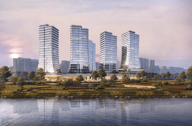 巨大的中央草坪、水月观景与公园呼应,内外双景。甚至还自带万豪旗下高奢酒店和万方商场,下楼就能尽享综合体配套。