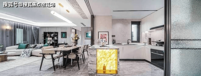 进门便是独立玄关,中间以凝脂玉玉石+隐藏灯带为基底,形成独立的置物空间,视觉观感和实用性兼具。