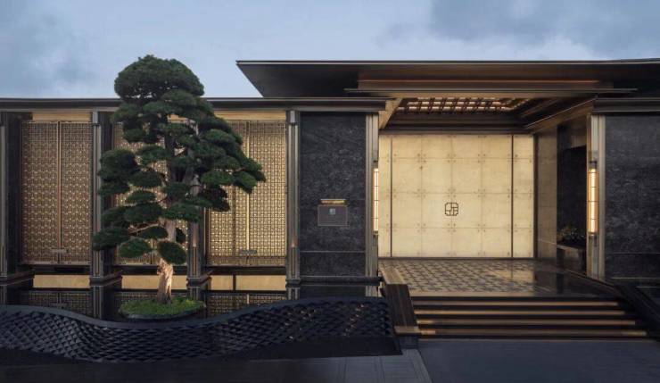 外立面采用四面铝板+巨幅玻璃窗墙的组合,主入口设计极具仪式感,约60米宽的门庭、百年罗汉松、融合良渚玉琮与西湖水韵的纹样。园林设计撷取南宋《四景山水图》意境,营造“一轴八境”;其核心亮点是约1500㎡的下沉式主题会所,内部配置了恒温泳池、健身房、SPA、私宴厅及茶室等,直面下沉庭院景观,将高端酒店式的生活方式引入社区。