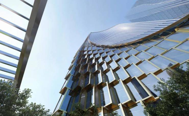 建筑外立面设计灵感来源于杭州自古享有盛名的"织锦",流畅的线条犹如灵动的"丝绸"倾泻而下,映射着奥体充满活力的城市景观。项目因地制宜,不同于传统的以商业为主的高密度综合体,引入各式裙楼、极具活力和公共性的开放空间,创造一个大尺度的“城市客厅”,打造一个动态有活力的村落式城市综合空间。