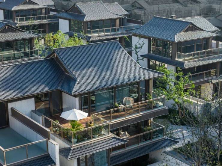 整体以“中国屋檐”作为核心设计元素,除了鱼鳞瓦、悬鱼等经典元素外,用现代手法将宋代用于官宅的歇山顶演绎尊崇,每一户的屋面和檐口结合风水做了多种变化,错落有致,户户私属。