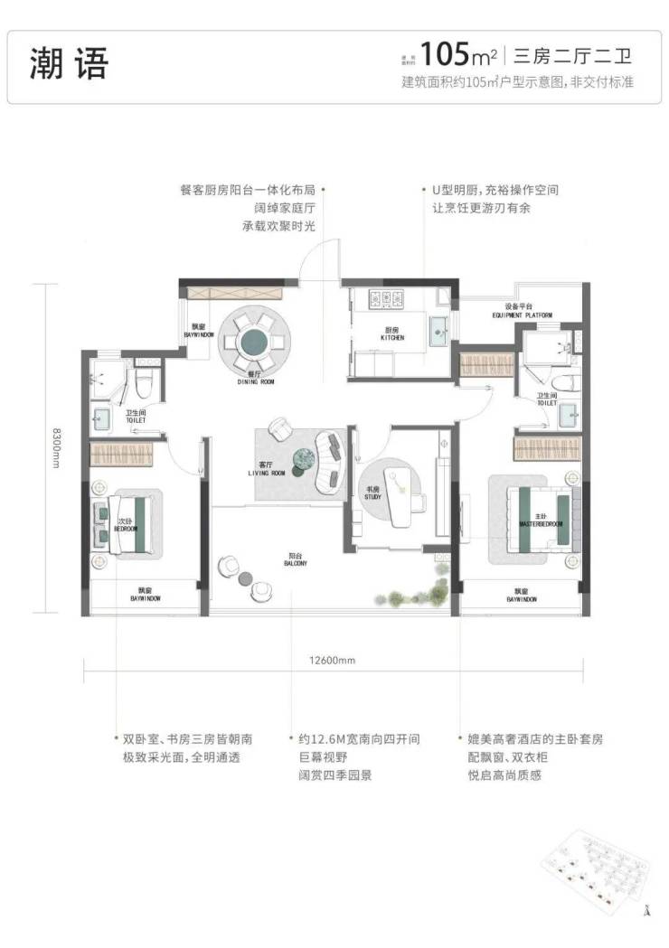 揽景小高层建筑面积约105-130㎡,为最大化景观面,突破性设计建筑面积约105㎡南向四开间。