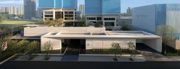 七株精挑细选的红果冬青,生长在层叠的悬浮水院之上。水底的幻彩蓝奢石倒映着天光云影,将杭州的立体山水浓缩进整片园林之中。
