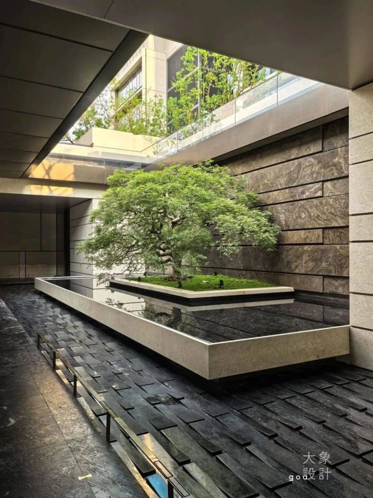 铜门之内,一株树龄200多年的进口羽毛枫翩然挺立。整个门头造价高昂,虽没有华丽的炫技,但透着精致低调的雅奢感。