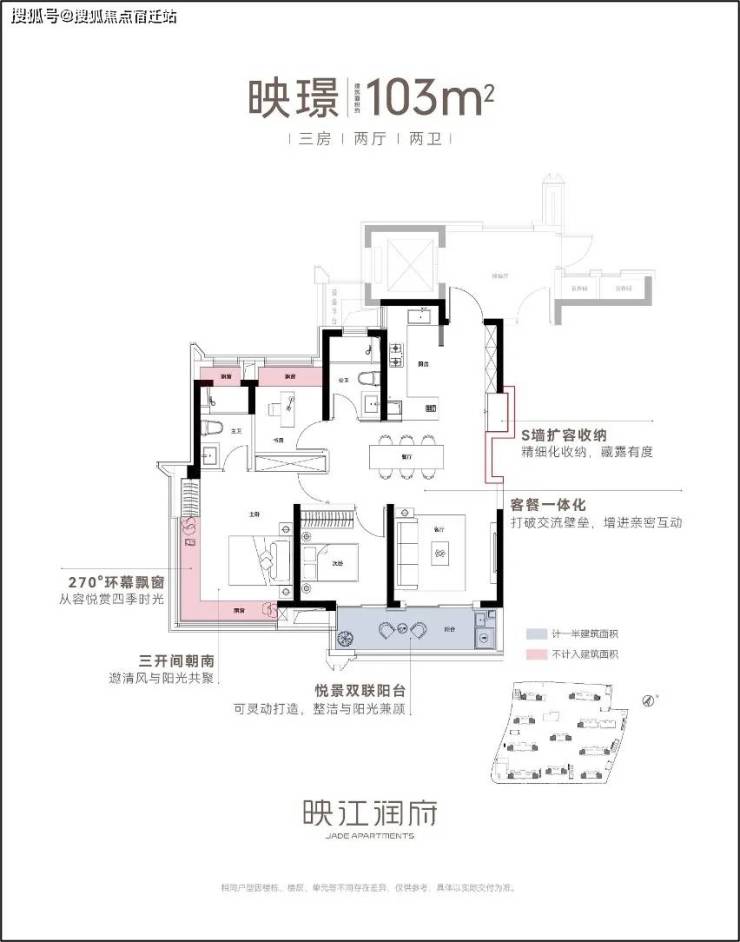 半开放式厨房设计时尚灵动,S墙设计科学收纳冰箱空间,藏露有度;厨房、餐厅、客厅及阳台一体化设计,空间通透性更强;值得一提的是阳台一侧特地做了270度转角景观阳台,实现采光通风效果更大化,相当人性化!
