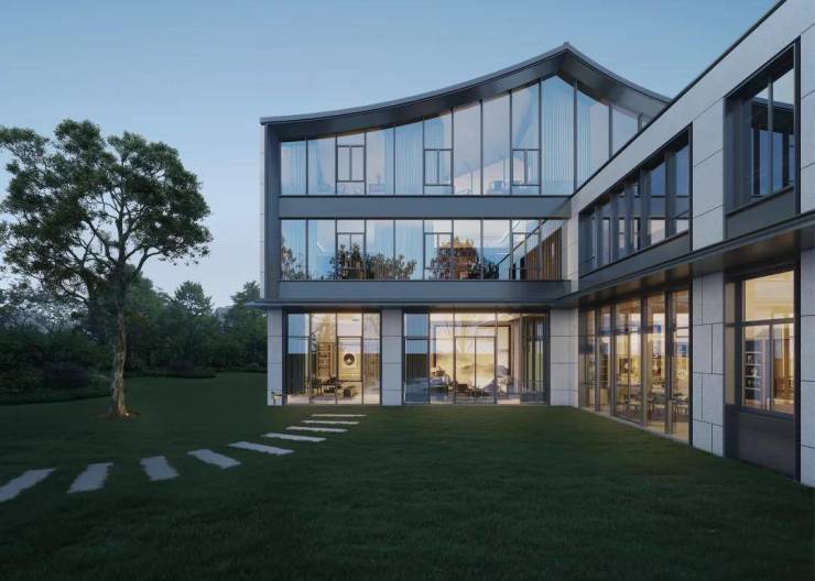 建筑的屋顶采用了非常东方的人字坡顶。通过大面积落地玻璃窗设计,模糊空间的边界感,建筑内部与外部协调融合,在获得充沛光线的同时,视野可以以更大的广度左右扫视,将更多风景迎入室内来。