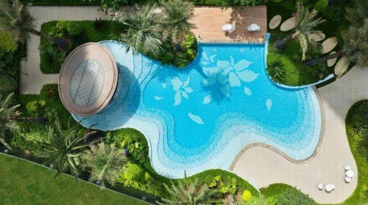 约13000㎡景观中庭,约12万㎡银湖公园,内外双园林体验。由安道设计担纲景观设计,花园融入了酒店度假风理念,搭配4座向公区打开的童玩、疗愈、文化、健身等主题架空层,营造出高端住宅追求的松弛度假感。