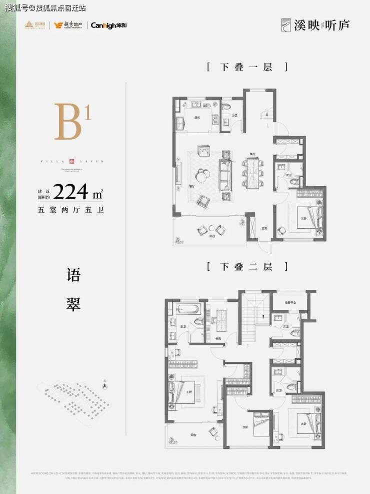 溪映听庐采用了错位排布,将上叠客厅和老人套放到四楼,连通露台;卧室移到三楼,避免上下叠间作息不同,互相影响,也方便上叠业主更好欣赏茶山美景。一层除了派对式公区外,还有一个套房可以给到家中长辈居住,