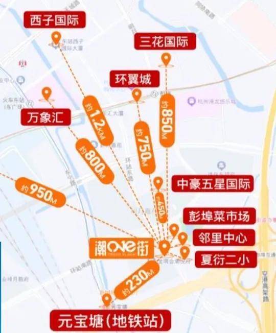项目拥有四通八达交通网,1.2KM内有杭州东站、沪杭甬高速、空港高架、钱塘快速路、及1.4.6.19号四地铁环绕等全能交通配套,距离元宝塘站仅约270米,快速通达全城,为项目注入源源不断地消费客流,人潮即钱潮。