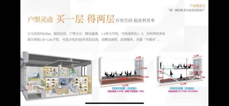 主力层高约4.95m,户型方正,格局通透,超高层高+高空间利用率,得房率高达97%,部分商铺可下挖1.05-1.2m,拓展后达6-6.15米层高,可做标准俩层,高赠送面积+高得房率,真正买一得二!