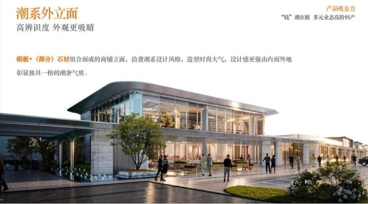 铝板+(部分)石材+大面积玻璃幕墙组合的外立面,潮系设计风格,造型时尚大气,由内而外的彰显独具一格的潮奢气质,是高端品牌及品牌展示店首选。