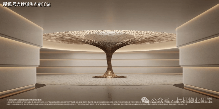 大门内外两重门厅景墙运用月光米黄石材近1000 方,搭配香槟金金属线条,汲取爱马仕全球旗舰店的双曲面叠墙造景手法,增加景墙奢华质感。