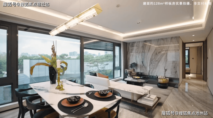 步入户型内部,堪称惊艳的则是大尺度餐客横厅,搭配高级感满满的全景落地窗,让空间真正成为了“光的容器”。