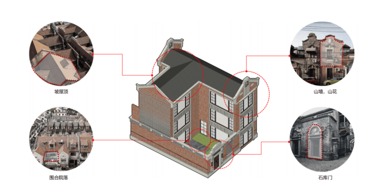 项目立面设计上,还原上海海派风格,同时使用老砖、老瓦、老石箍等保留构件,最大限度贴近场地历史。