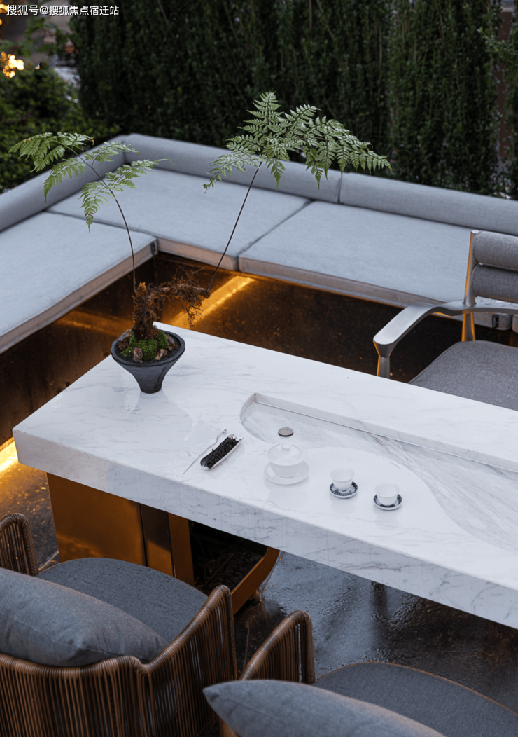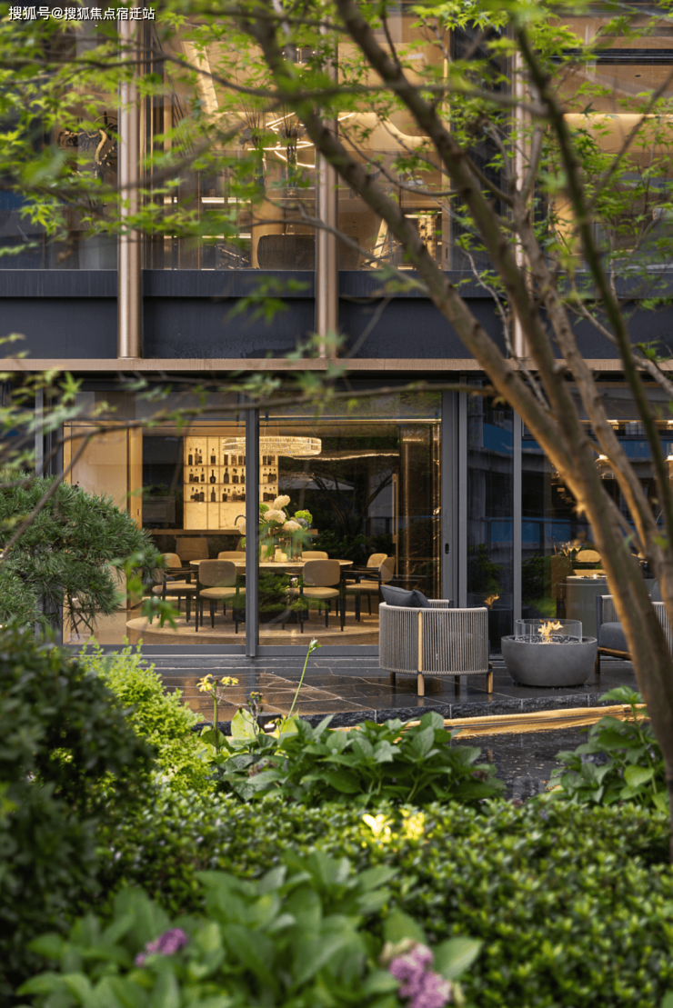 庭院犹如一片静谧的绿洲,在城市高楼间开辟出一隅难得的闲适,绿意掩映间,将杭州之门嵌入日常。环形座椅围炉而设,烈焰跃动中升腾出微暖的光影。这片庭院,是城市与自然在时光深处的默契回响。