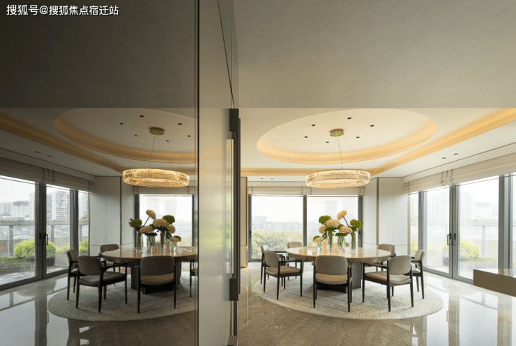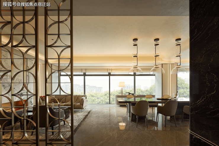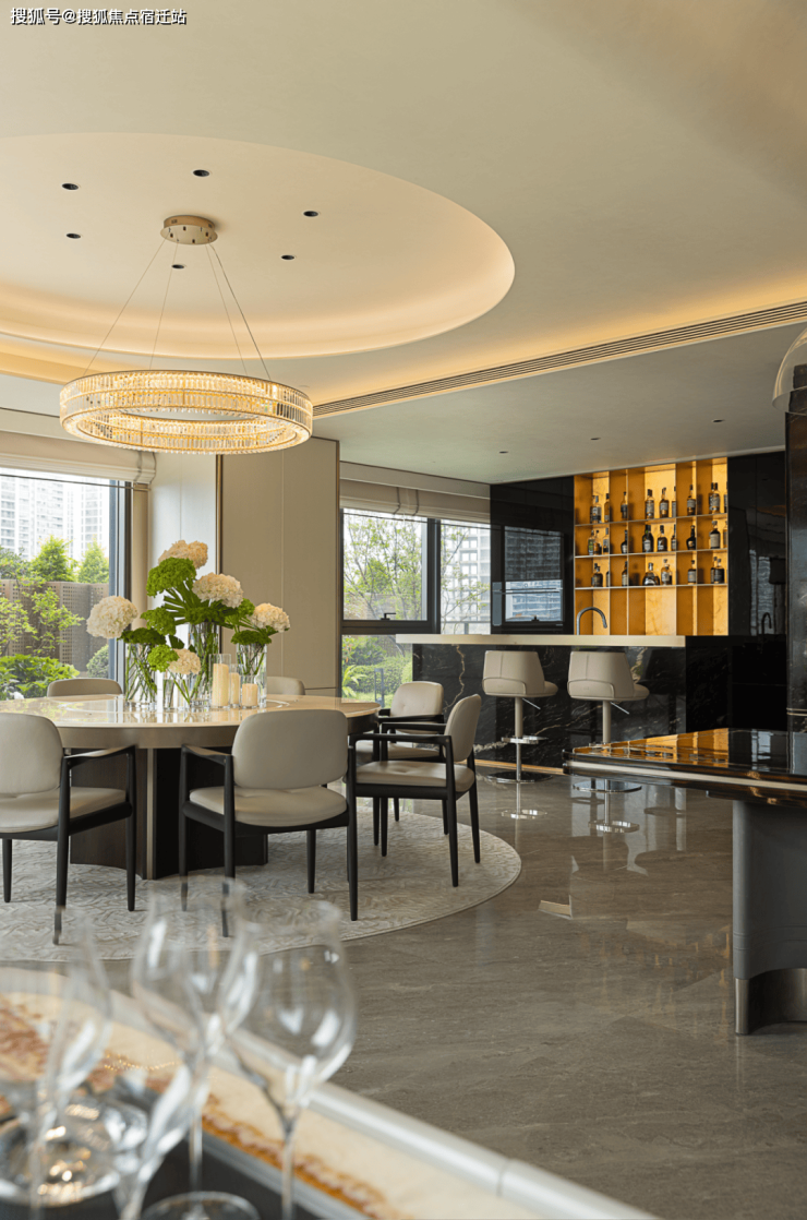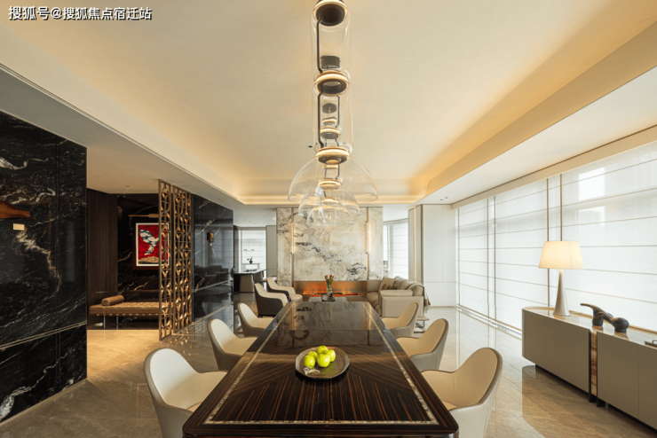 餐客厅被巧妙地划分为两大区域。修长的西餐餐桌沿空间中轴延展,通透的吊灯和天然石材背景,呈现出现代的冷静与和谐。