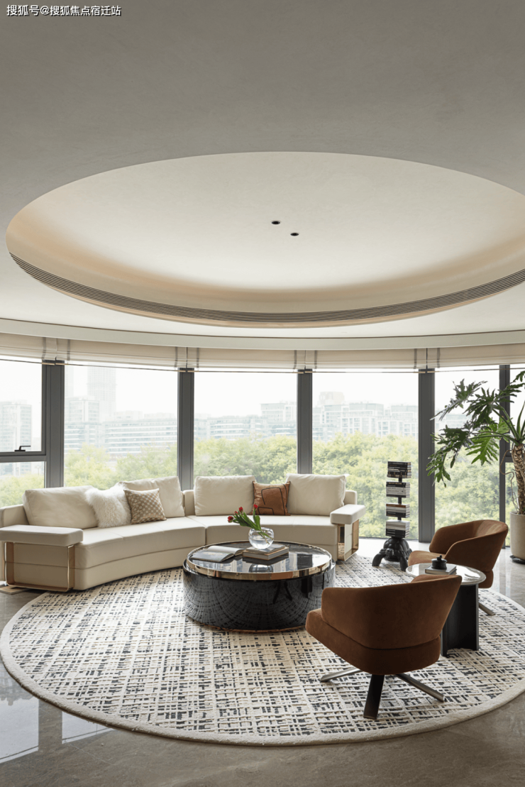 会客区以圆润的吊顶衬托开阔的视野,漫射的光线从弧形边缘倾泻而下,温柔,亲昵。大理石与木饰面的搭配将现代质感与沉稳气息融为一体,中央圆桌与沙发围合出一个交流的温暖场域。