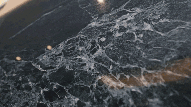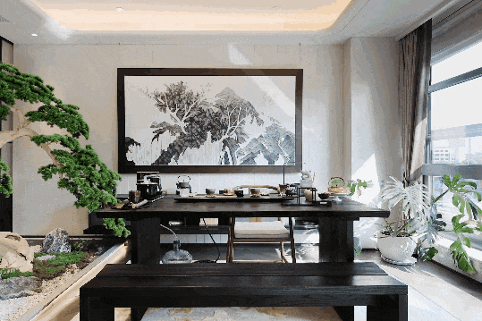 以320㎡户型为例,客餐厅及主卫地面、台面以“鱼肚灰”铺陈留白,客厅背景墙及岛台则使用“君子兰”,按照纹理延续进行拼接后,既似兰花又似泼墨山水,两者共同作用下,营造出中国山水画的意境。