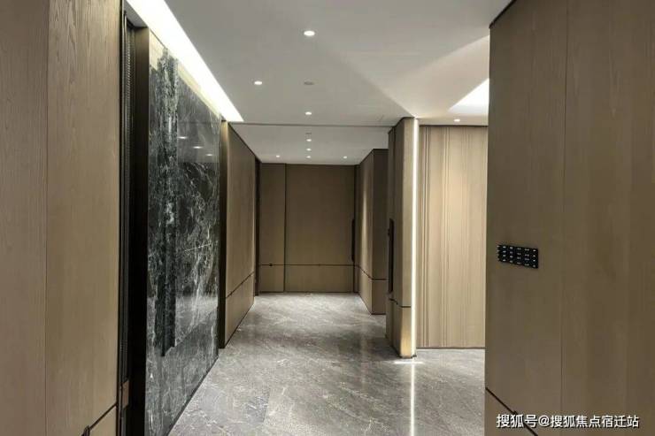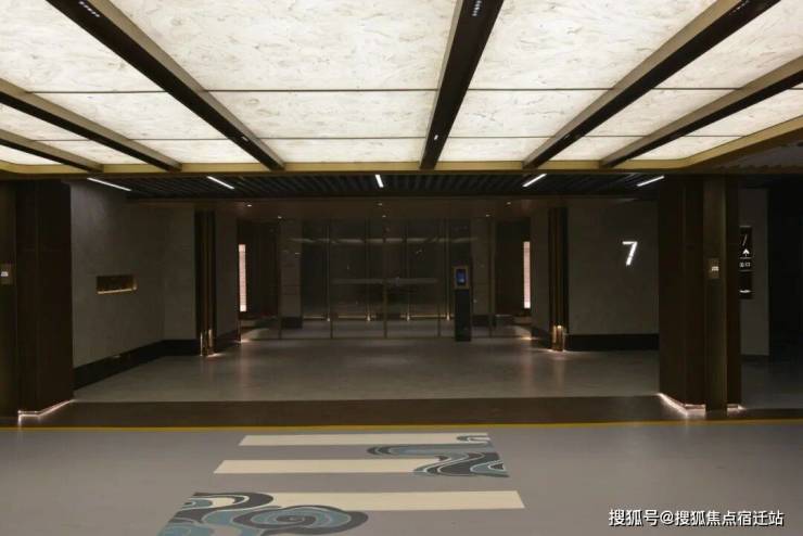 顶面采用大面积金属铝板,搭配透光云石天花洒落斑驳光影,两侧浅色大理石与发光楼栋标识辉映,为功能空间增添艺术气息。