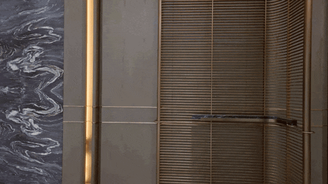 6米挑高空间内,四块香槟金色仿铜不锈钢制成的金属格栅从地面直达顶部,搭配八块精致连纹的天然石材,奢华而不失优雅,营造出气势恢宏的视觉效果。