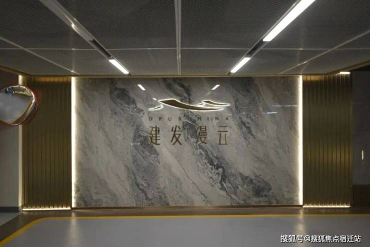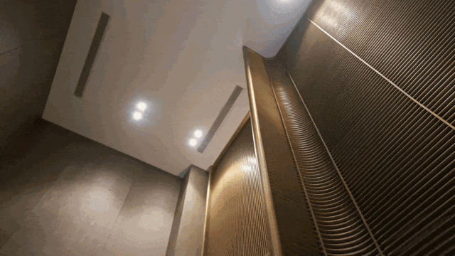 车道转角处,墙面设置整面岩板背景墙和金属格栅装饰。墙面上,“建发缦云”四个大字熠熠生辉,与祥云花纹相得益彰,既彰显了项目的尊贵身份,又赋予了空间浓厚的文化底蕴。