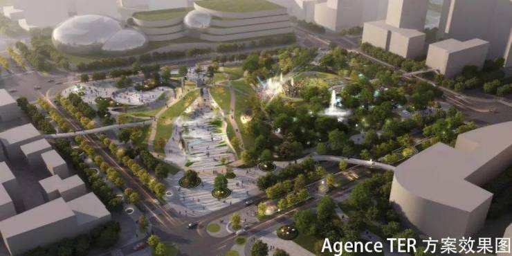 AGENCE TER方案:以古代杨思镇石桥“杨师桥”为设计灵感,通过流淌变换的立体慢行系统沟通中央公园地上景观与地下空间、中央文化轴等城市功能空间,定义生态、立体、多元的生活目的地,建立链接未来的杨思之桥。