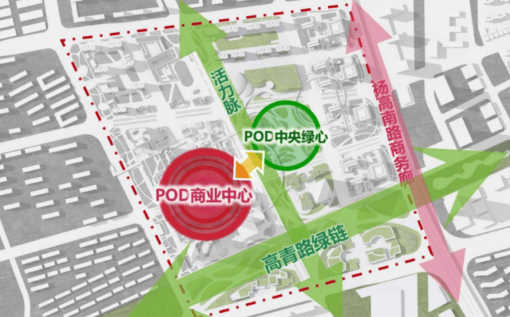 其中,日本设计为新杨思区域提出了一个超前规划理念:Double POD (Park Oriented Development + Pedestrian Oriented Development),即以生态公园为导向+以城市漫步为导向的城市开发模式!其设计重点为中央绿心与商业中心双核联动!