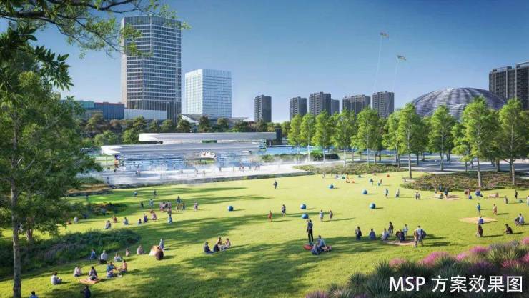 MSP方案:以蓝绿网络为媒介,通过地下商街、人车共享界面、活动草坪、社交媒体花园等手法构建景观与商业、文化无界融合的中央公园,形成融合生态智慧与海派街道文化的公共文化生活中心。