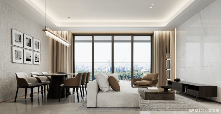 再来看B户型,承接A户型优点的基础上,采用了大横厅的设计,使得南向开间增加到4个,11.7米的南向面宽结合超大阳台的设计,让户型客餐厅无论采光和尺度感都达到了大平层级的体验!令人印象深刻!