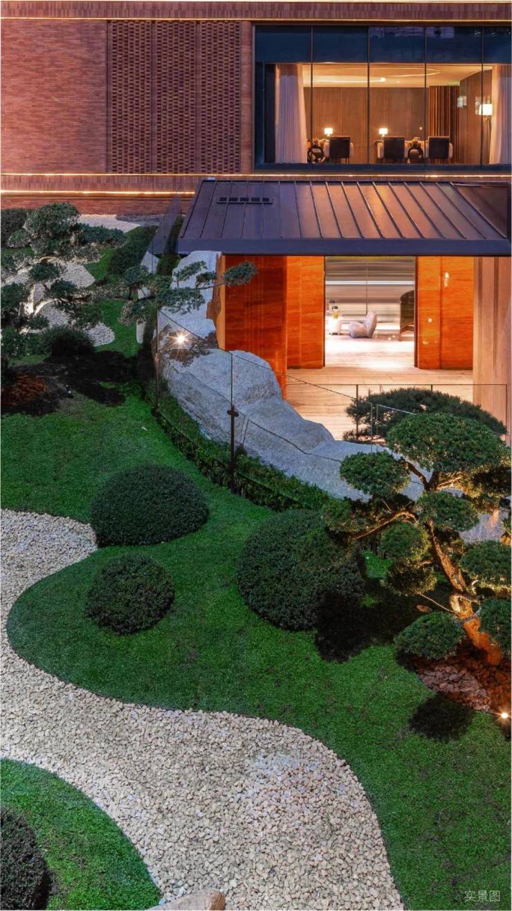 山水庭院汲取《足立美术馆》的造境手法,以老石皮、百年古木原样搬运,重现山间岁月的自然痕迹,与庭院中的光影交织,仿佛将山间的自然采光与静谧之感搬入城市。阳光透过树梢洒落,石皮上的纹理在光影中若隐若现,宛如一幅流动的自然山水画卷。