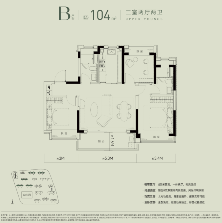 最后,一起来看新杨思上园的此次四期推出的收官产品线:建面约104㎡3房2厅2卫户型,该户型规划有A\B两款设计,为改善人群提供更多样的选择!