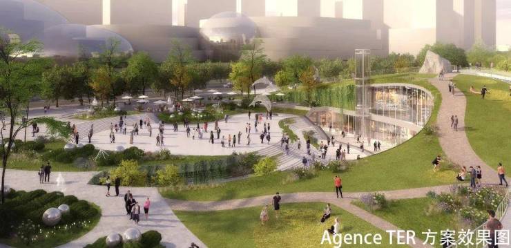 AGENCE TER方案:以古代杨思镇石桥“杨师桥”为设计灵感,通过流淌变换的立体慢行系统沟通中央公园地上景观与地下空间、中央文化轴等城市功能空间,定义生态、立体、多元的生活目的地,建立链接未来的杨思之桥。