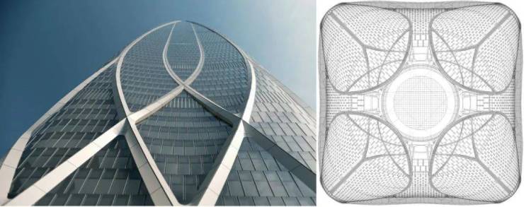 与传统高层建筑的框架结构系统相比,宁波中心塔楼柔和、有机的斜交网格结构的自然收分处理,打造出结构柱数量自下而上自然递减的效果,并尽可能减少了大部分楼层的结构柱数量,有利于实现更为开敞的楼板,获得更佳的视野,实现室内布局的灵活性。