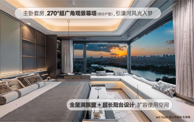 •约3.1米层高与约5.6-5.9米宽厅尺度,构建出朗阔大气的空间感,搭配超尺寸落地窗和约270度观景窗设计(部分户型),将千年濠河的秀丽风光无缝引入室内,实现自然与生活的无界交融。