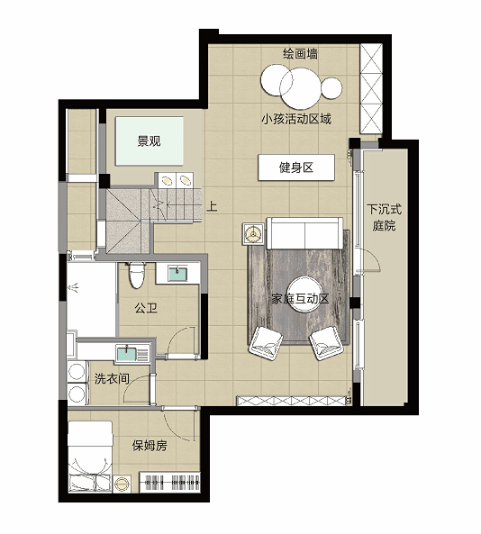 拾级而下,来到下叠户型近100平米的地下空间,阳光却并没有被隔绝。通过超大尺度的下沉式庭院和采光井,下叠的地下空间也能拥有自然的新风与阳光,整体的居住体验更为人性化。