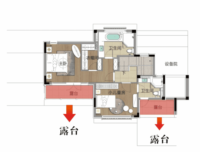 上叠首层设置有客餐厅、两个卧室,并带有两个空中庭院。