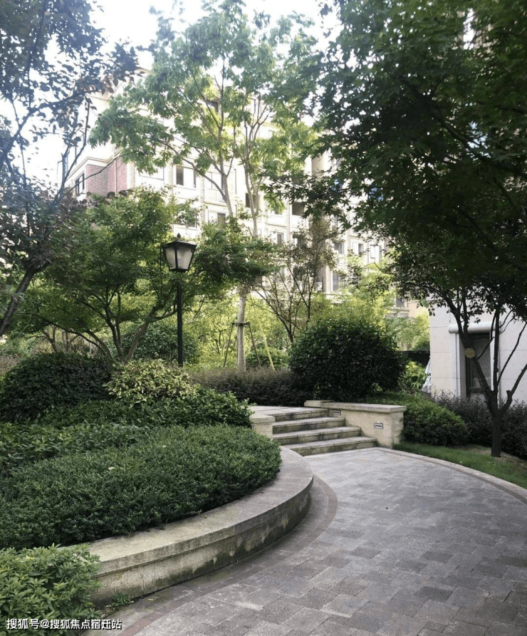 园林密而不挤,草皮与树种灌木比例适中,结合弧形小道,品质颇高。