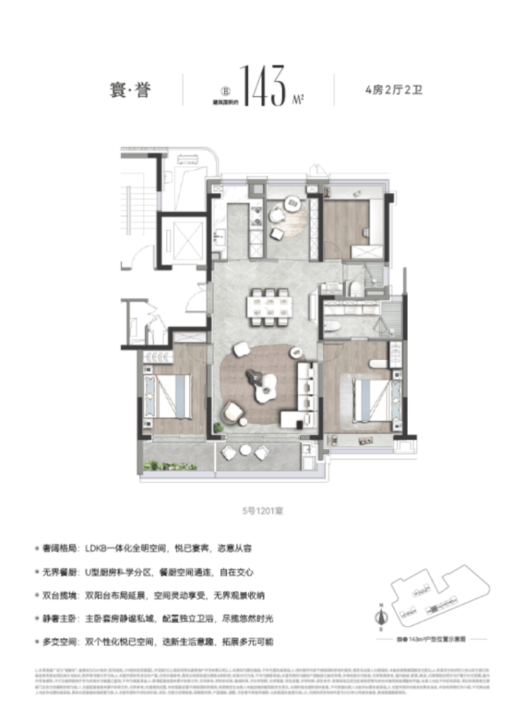 建面约143㎡户型,以最高约14.2米的南向面宽,重新定义内环尺度。准一梯一户与约8㎡的独立电梯厅,构成了归家的尊崇序章,并可整体定制为顶天立地的收纳系统,将奢侈留给日常。