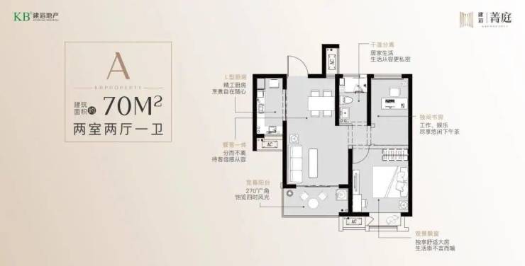 ① 建面约70㎡,两室两厅一卫。刚需置业的爆款之选,空间利用十分高效,性价比高。餐客厅一体化、南向观景飘窗卧室、270°观景阳台,都让空间显得更加开阔明亮;干湿分离卫生间、L型厨房,区域功能划分明确。
