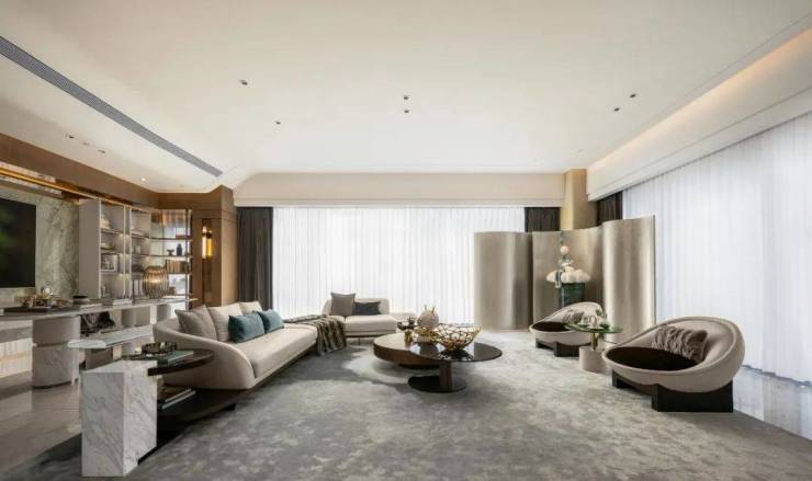 在独处、家庭和社交场景间自如切换,现代的游园之境,亦是心中的静谧之地,背景墙以绒面材质、叶面的曲线分割结合金属,形成质感丰富而柔和温润的空间氛围,憩于自然生活美学,获得精神的愉悦放松。华丽、艺术、时尚元素,赋予奢华空间新内涵。