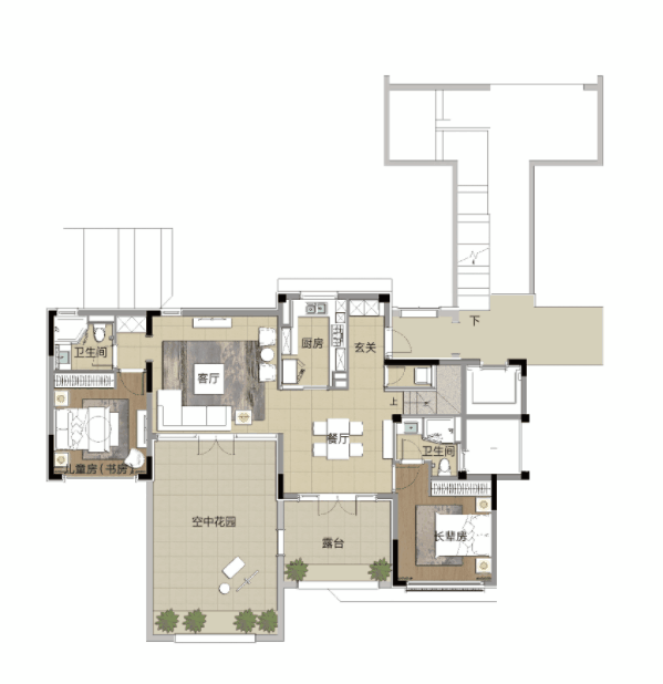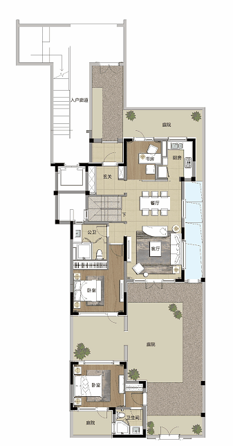 上叠首层设置有客餐厅、两个卧室,并带有两个空中庭院。