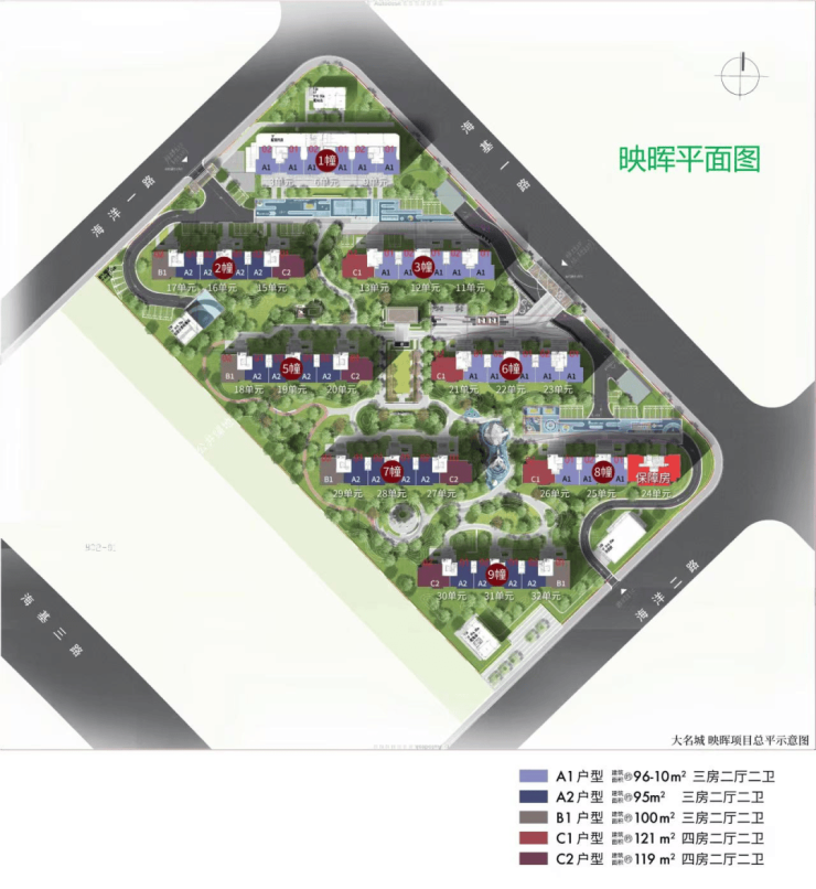 【大名城·映玥】此次推出主力户型为建面约84-96㎡(3房)的洋房,1梯2户私密设计,容积率低至约1.2,建筑密度约21.65%,车位配比1:1.1。