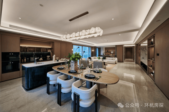 大平层面积在315-320㎡之间,都是精装交付。从公开的样板间来看,做得比较有诚意的一点是,它的餐客厅面积非常大,边套约80㎡,中间套甚至达到约100㎡。这样的尺度,在同总价段产品中并不多见。