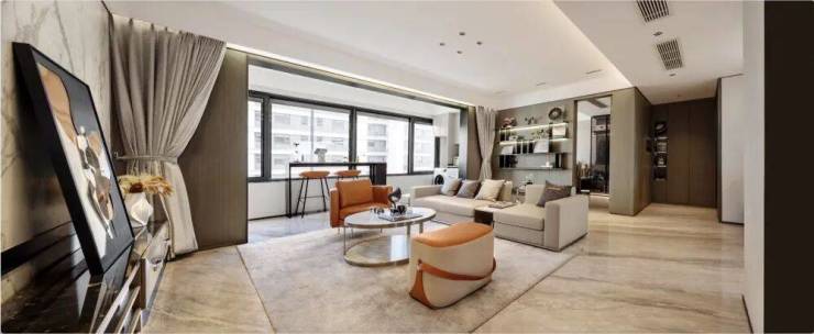 作为家庭的「情感枢纽」,约 5.6 米真横厅以 IMAX 级尺度重新定义社交主场:当阳光透过窗户铺满地面,这里既是先生宴请宾客的「私宴厅」,也是太太举办下午茶会的「茶艺厅」;孩子可以在宽敞地面搭建乐高城堡,老人能在临窗茶台摆弄文竹盆景。