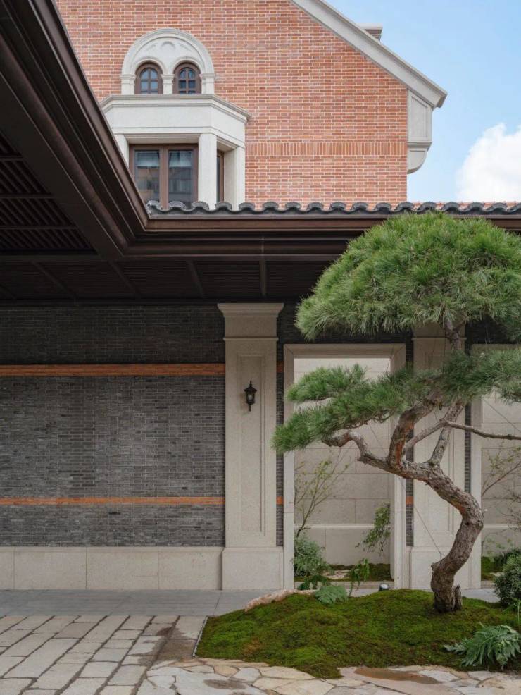 最近开放的建筑面积约500平米大宅,用的是红砖立面。红砖不是贴上去的,而是用了比石材干挂还要复杂和昂贵的穿孔干挂工艺。