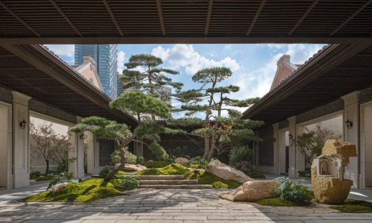 ·他们把三棵泰山油松载在庭院中,与中国屋檐一起,给你带来更浓郁的山岳意象……