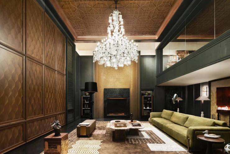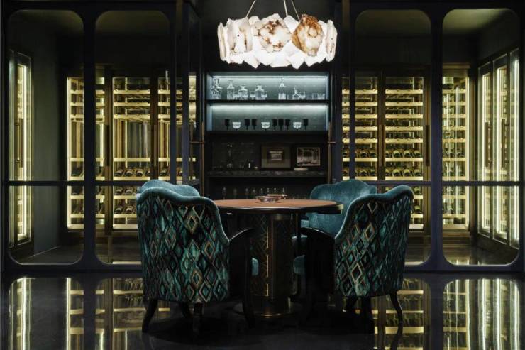 因为层高足够高,地下空间同样可以做成光芒璀璨且功能丰富的双层空间,这样的双层挑空足以悬挂一盏大型水晶吊灯。