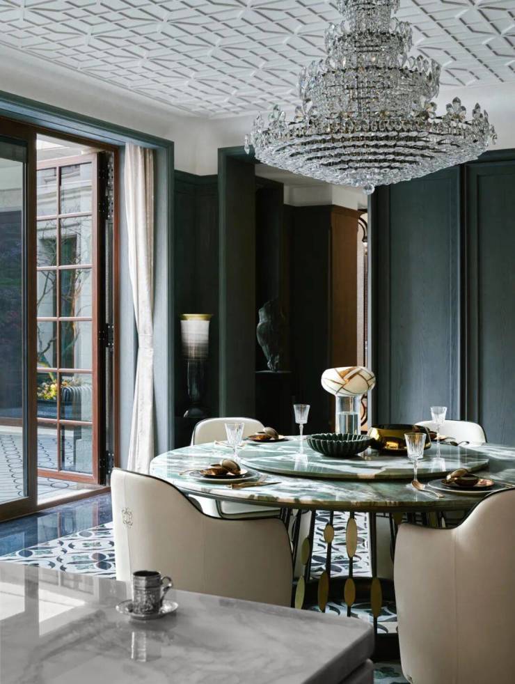 客厅、餐厅、一楼套房,都围绕着这座庭院展开,三面都是大面积的采光。超大的客厅汇集了各种珍稀的家具陈设,地面的海派花砖在室内从客厅通铺到餐厅。你可以从客厅信步进入庭院,也可以从庭院直接进入海派风情浓郁的餐厅。餐厅里放得下大圆桌,放得下岛台,还能放得下一个更大的料理台。